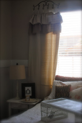 Once the board and batten was up, color was on the walls, it was time to create some window treatments. I simply purchased a drop cloth, added some burlap ruffles to the top, and in no time some texture was added to the room via the quick, simple, and very inexpensive window treatments.